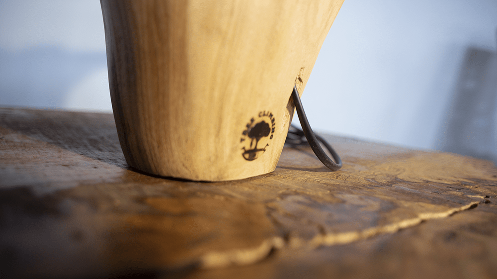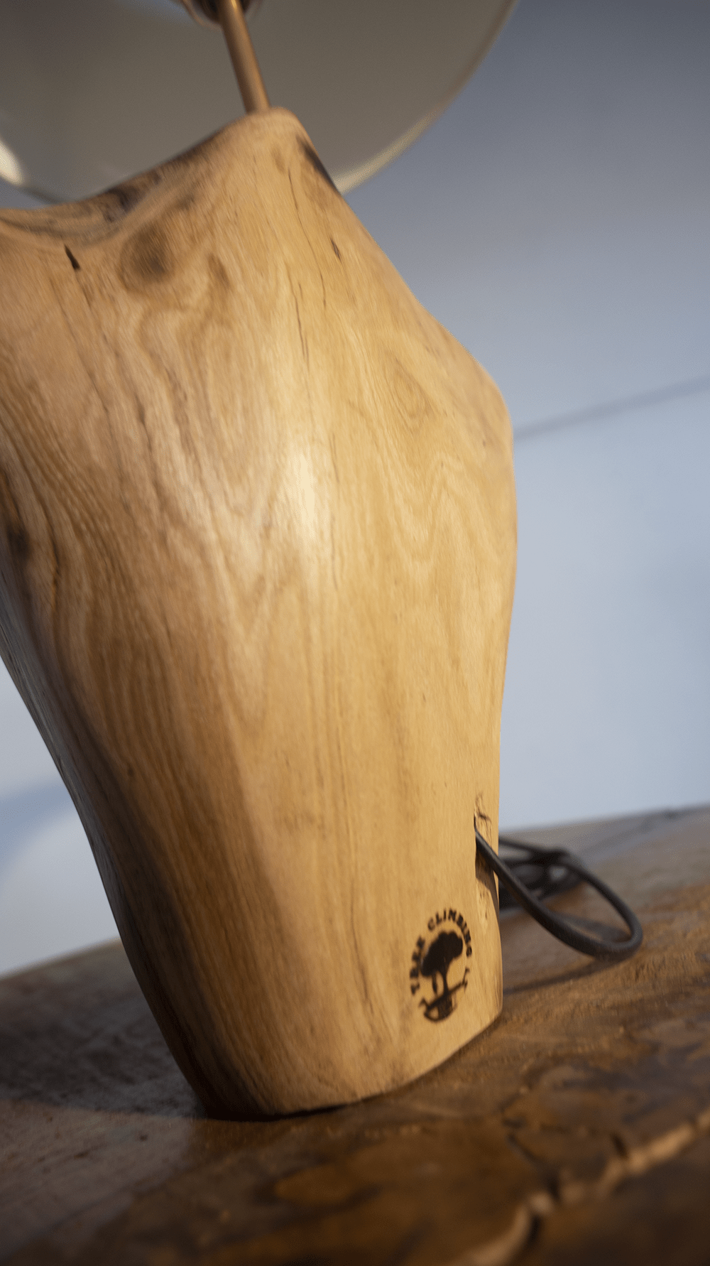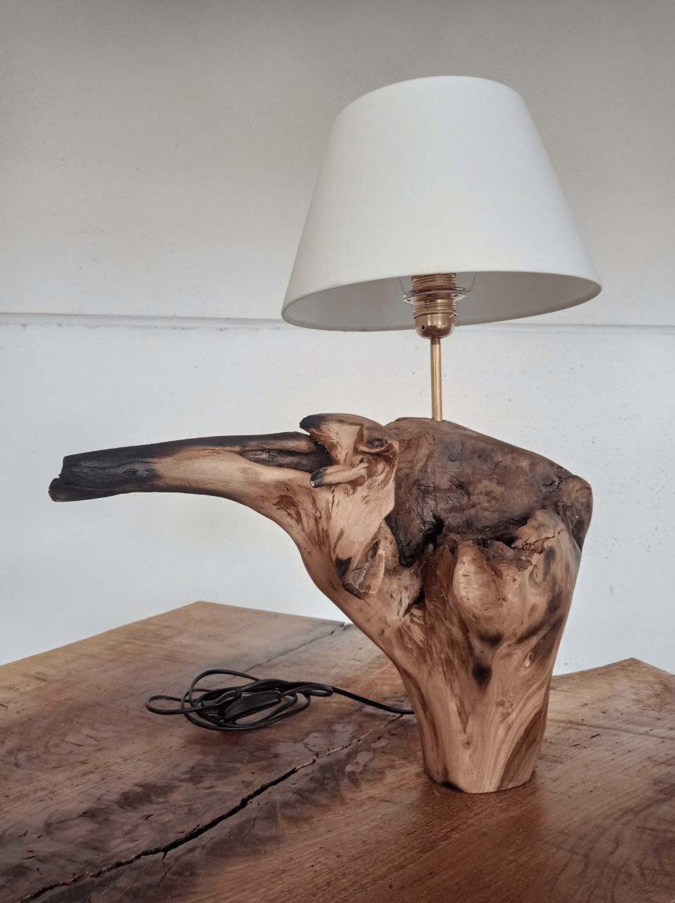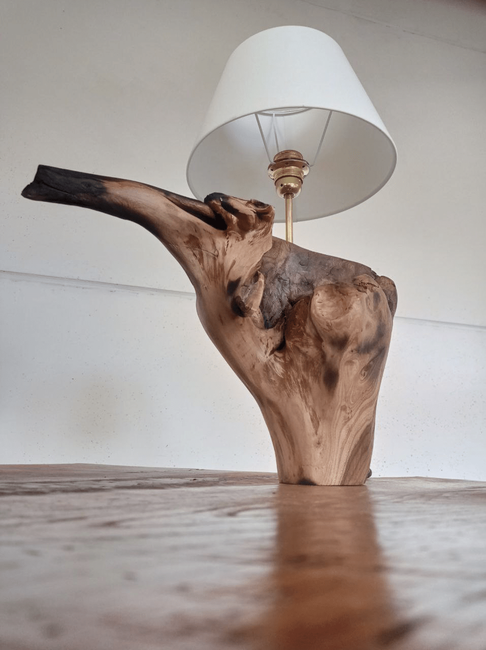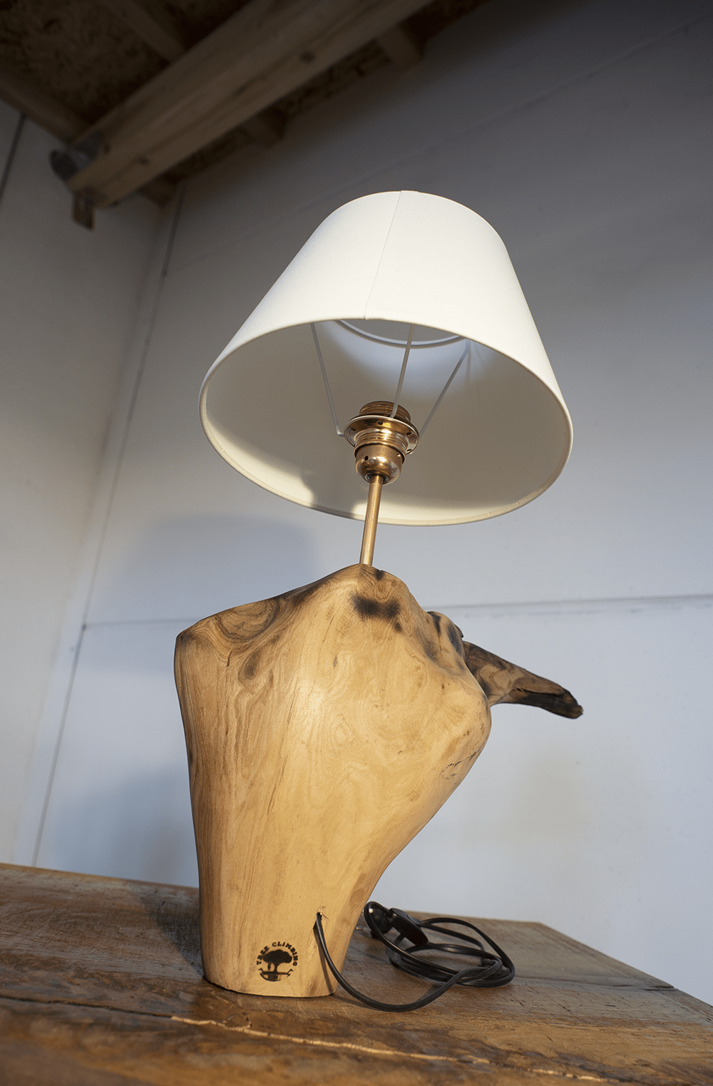 La lampada da tavolo in legno di ulivo è realizzata a mano, utilizzando una parte di olivo recuperata da un incendio.