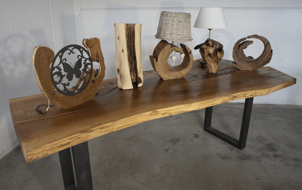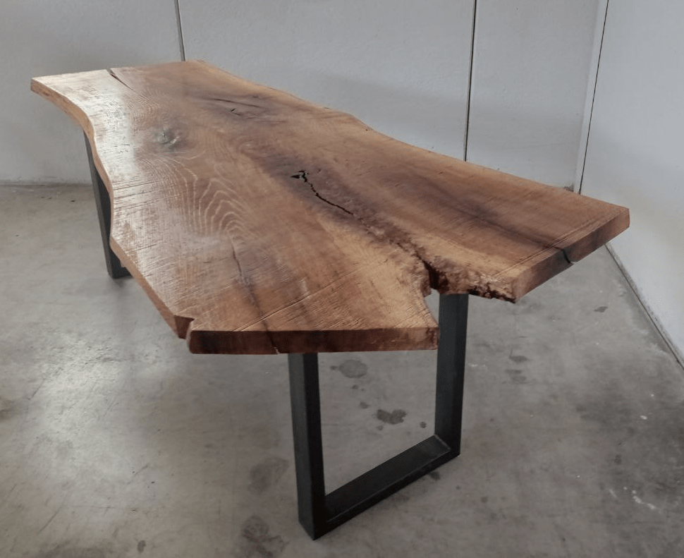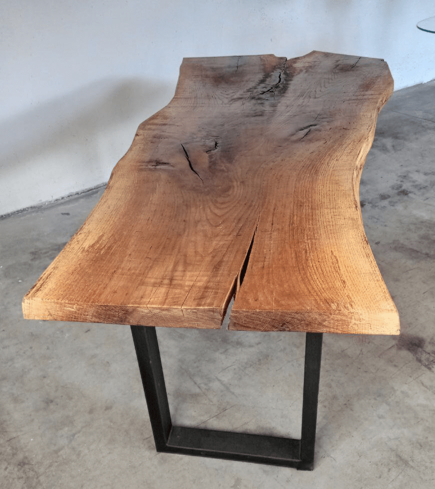 L’elegante tavolo prodotto per la linea “Amico Legno”, è realizzato in legno di quercia con taglio unico di spessore 5cm. L’importante peso, prodotto dal pezzo unico di quercia e la struttura di ferro sulla quale questa appoggia, conferiscono al tavolo una forte stabilità.