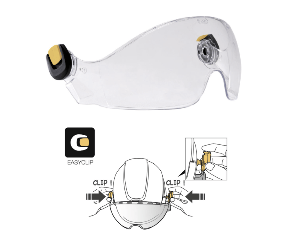 La visiera VIZIR garantisce la protezione degli occhi contro i rischi di proiezione. S’installa facilmente sui caschi VERTEX e STRATO, grazie al sistema di attacco EASYCLIP. Beneficia anche del trattamento antigraffio e antiappannamento.